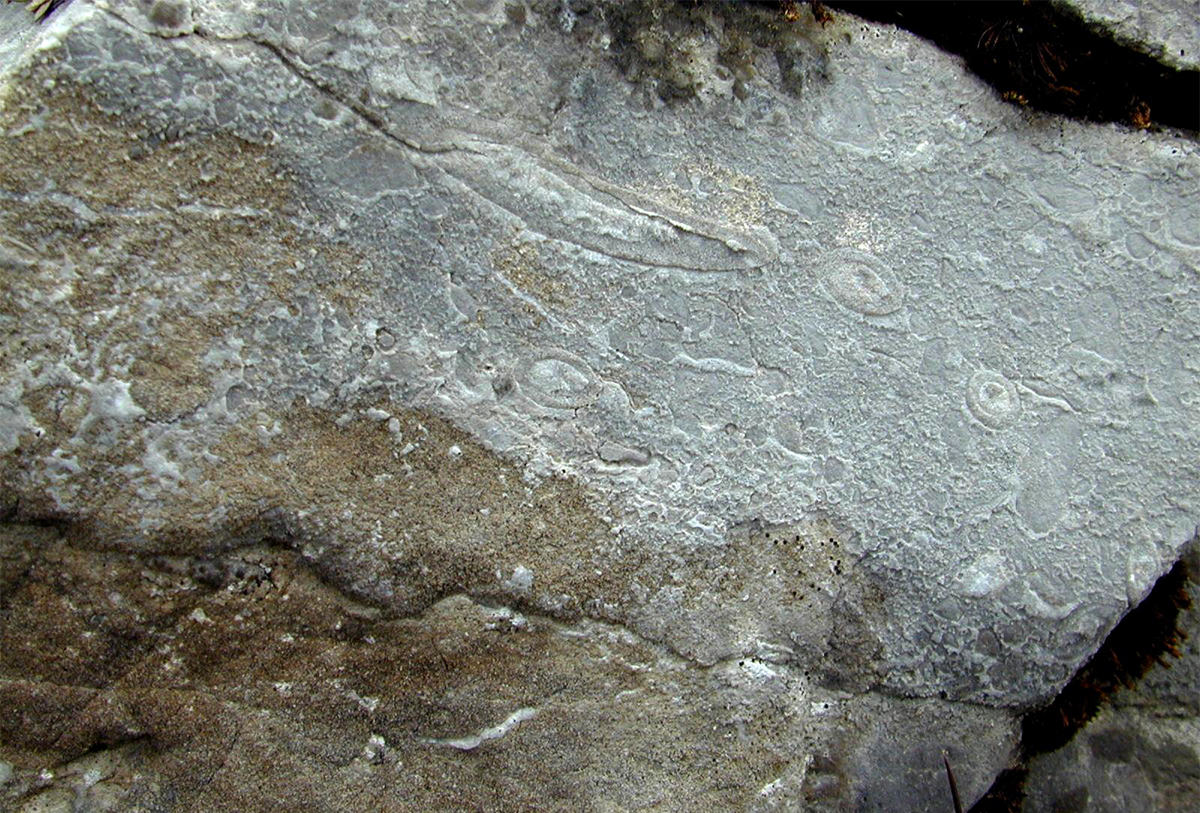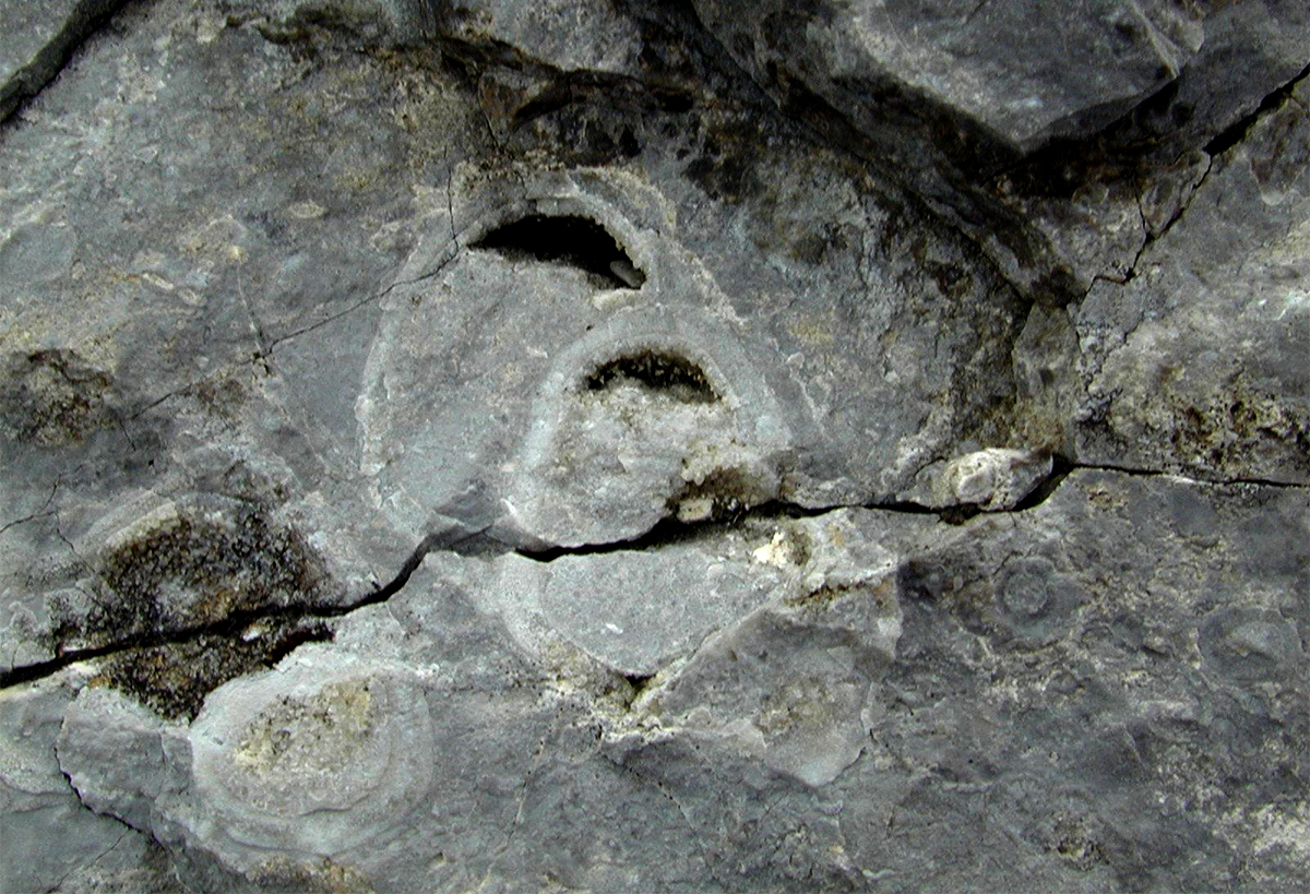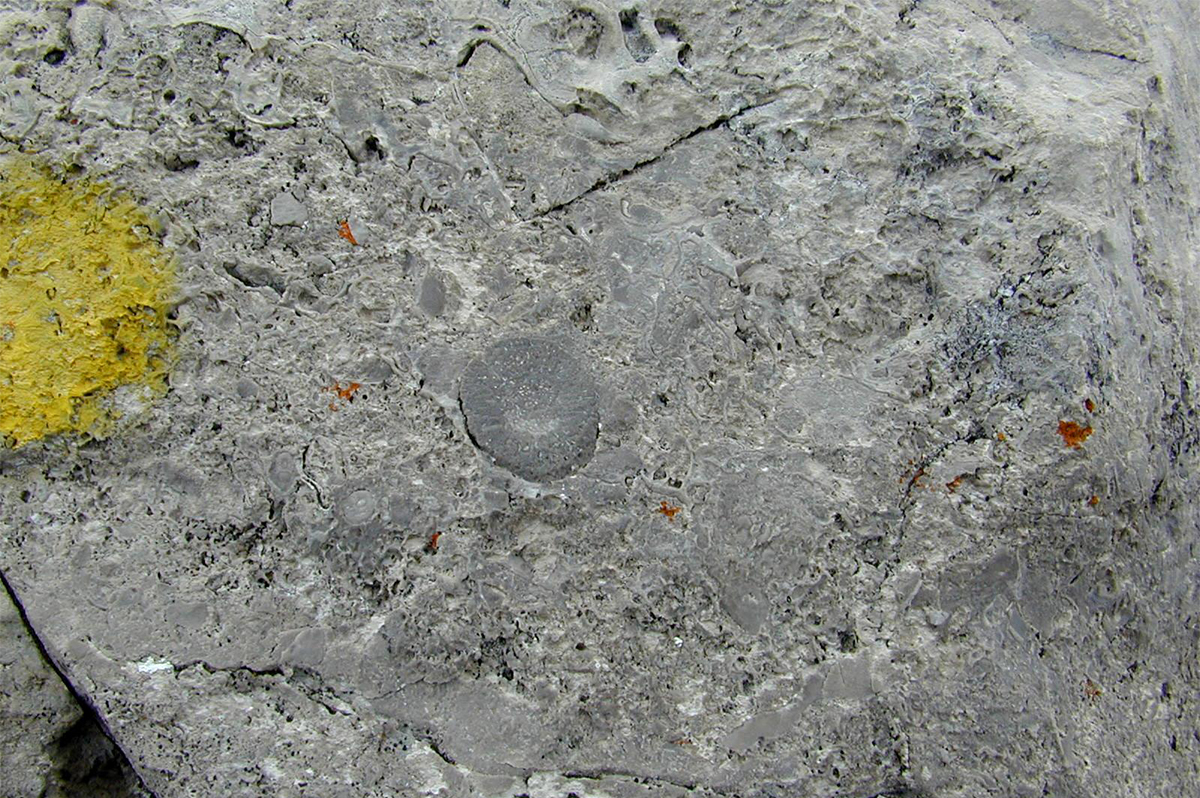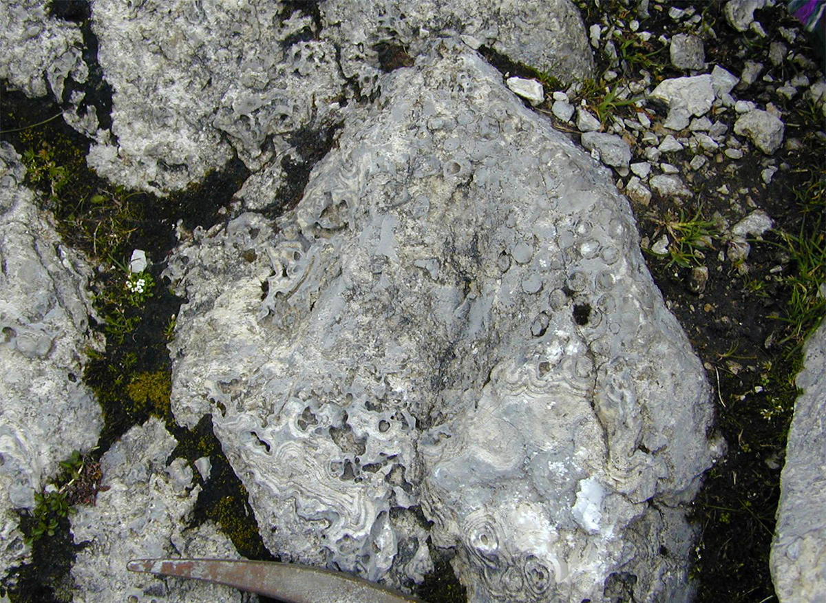 Das Riff wurde von folgenden Organismen aufgebaut: Korallen, Sphinctozoa, Bryozoa, Blaualgen, Rotalgen und Tubiphyta. Direkt im Gipfelbereich (sozusagen unter unseren Füßen) können wir fossile Grossoolithen, Schwämme und Korallen beobachten.