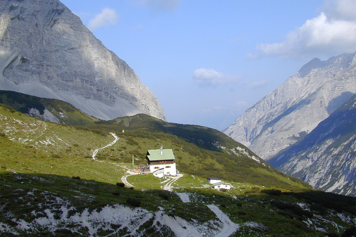 Nach einer hoffentlich guten Nacht in der Pfeishütte steigt man zum Kreuzjöchl (2158 m) an der Ostseite der Rumerspitze auf.