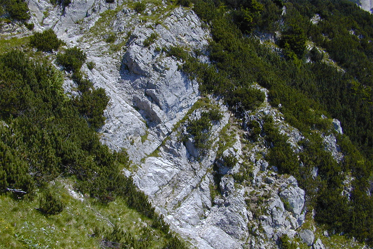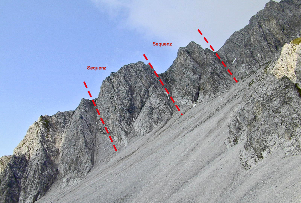 Wir steigen ca. 50 Hm vom Kreuzjöchl nach S ab; hier öffnet sich uns ein guter Ausblick auf den gebankten, steil nach N einfallenden Wettersteinkalk.