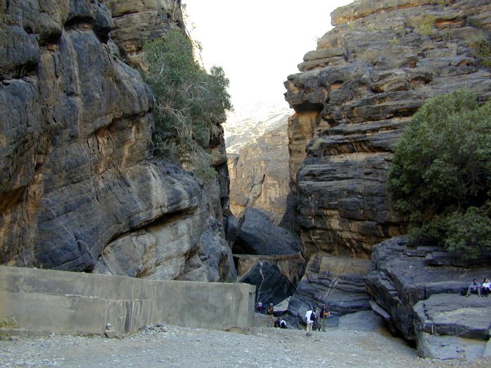 Kurz vor der kleinen Siedlung Al Hajir fährt man durch neine enge Schlucht (Bild 2) deren vertikale Flanken von der Hajir-Fm gebildet werden. Wir sind also nocheinmal viele Millionen Jahre in die Erdgeschichte zurück gegangen. Es handelt sich hier um schwarze, massige Kalke, die bituminös sind und beim Anreiben nach faulen Eiern riechen. Dies läßt auf anoxische (sauerstoffarme) Bedingungen schließen. Fährt man von Al Hajir zuerst kurz nach Westen und dann im Wadi Hajir weiter nach Süd-Westen, so bewegt man sich zwischen den Gesteinen der Mistal-Formation (Bild 3):