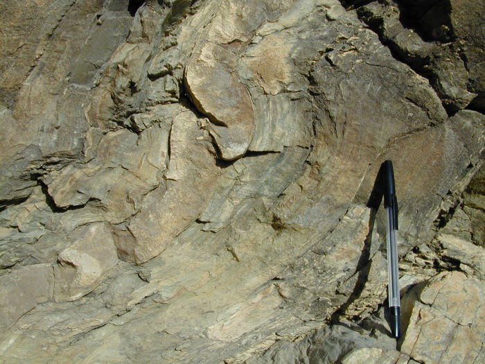 Gleich am Anfang des Tales fährt man entlang der dunklen Dolomite der permischen Saiq-Formation, die reich an Crinoiden, Brachiopoden und Foraminiferen sind. Bei der Weiterfahrt liegt links und rechts des Wadi wieder die Kharus-Formation, über die die uns nun schon bekannte Winkeldiskordanz mit der Saiq-Fm liegt. Nach 3,3 Km erreicht man die unter der Kharus-Fm liegende Muayidin-Fm. Es handelt sich dabei um grüne und rosa Silt- und Tongesteine (also klastischen Ursprungs). Interessant ist die teilweise starke Verfaltung dieser Gesteine, die auf eine Kompressionsphase im Prekambrium schließen läßt. Bild 1 anklicken